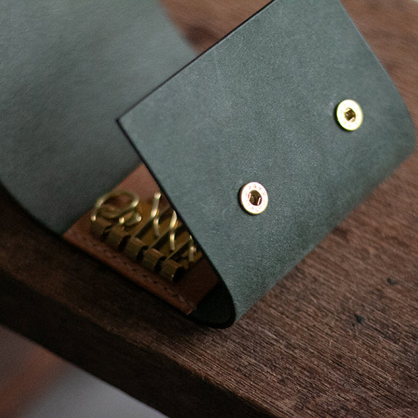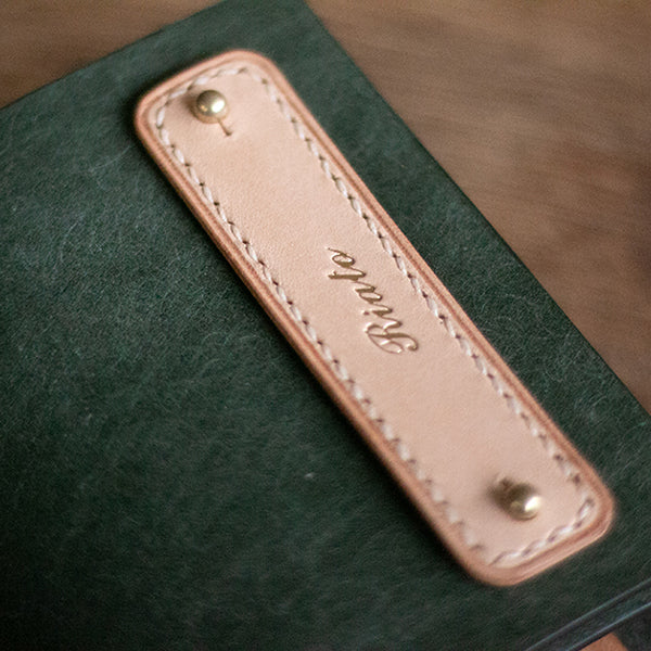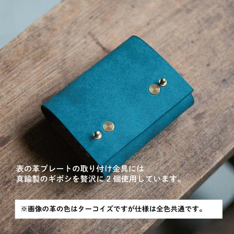 ・刻印プレートの留め具は、真鍮製のギボシを使用しています。こちらも経年変化による色味がお楽しみいただけます。